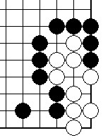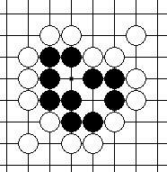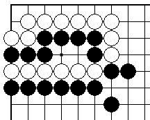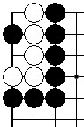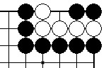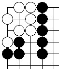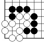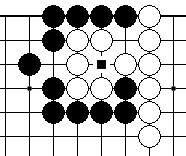 左图是“无眼双活”之形,双方的棋子连一只“眼”都没有,但又都不是死棋。这是因为在双方两块被围困的棋子中间,正好存有两口“公气”。此时,任何一方又都不敢在这两口“公气”中的任何一处下子,否则,自己的一块棋反要被对方吃掉。