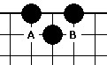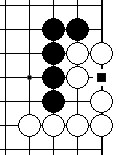 右图是“有眼双活”之形,相互围困的黑白两块棋各自只有一只“眼”,但巧的是,在这两块棋之间,正好有一口“公气”。此时,谁要是贪心的想通过把子下在“公气”上去“叫吃”对方,则自己的棋子也将“没气”了,反而要被对方吃掉。所以,双方在此处都只能明哲保身。
