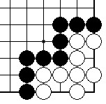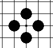以上定义中所提到的“眼”,是围棋对局中最常用到的专用术语之一。所谓“眼”,实际上就是棋盘上被某一方用棋子围住的一处空白交叉点,如下图。