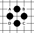 黑眼周围的ABCD四个点叫做这个眼的眼角。当两个或两个以上的眼角被对方占到,这个眼就成为假眼;当有三个眼角被自己占到或对方不能进入,就叫做真眼。有两个或两个以上真眼的棋是活棋。