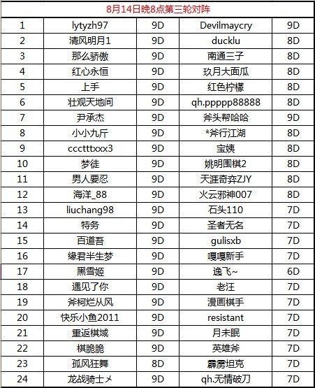 第三轮 8月14日 (周三)20:00 (第三轮)