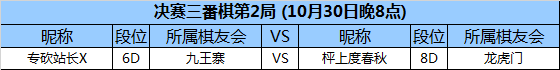 第九轮 10月30日 (周1)20:00 (决赛三番棋次轮)
