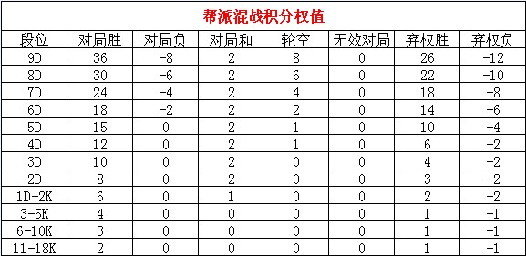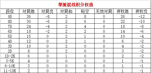在各大帮派的支持下,棋魂帮派混战已经顺利运营了8个月,在大量的运营数据下我们也发现了混战规则的弊端,鉴于此种情况,我们决定调整混战的积分策略,新的混战细则现公布如下: