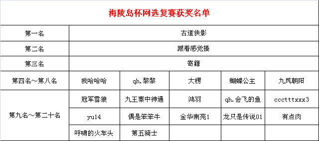 注:前二十名的选手需要参加完海陵岛杯的所有比赛和闭幕式以后,由选手本人亲自领取。发放方式为银行转帐请尽快提供相关资料。未尽事宜由主办方单位另行通知。