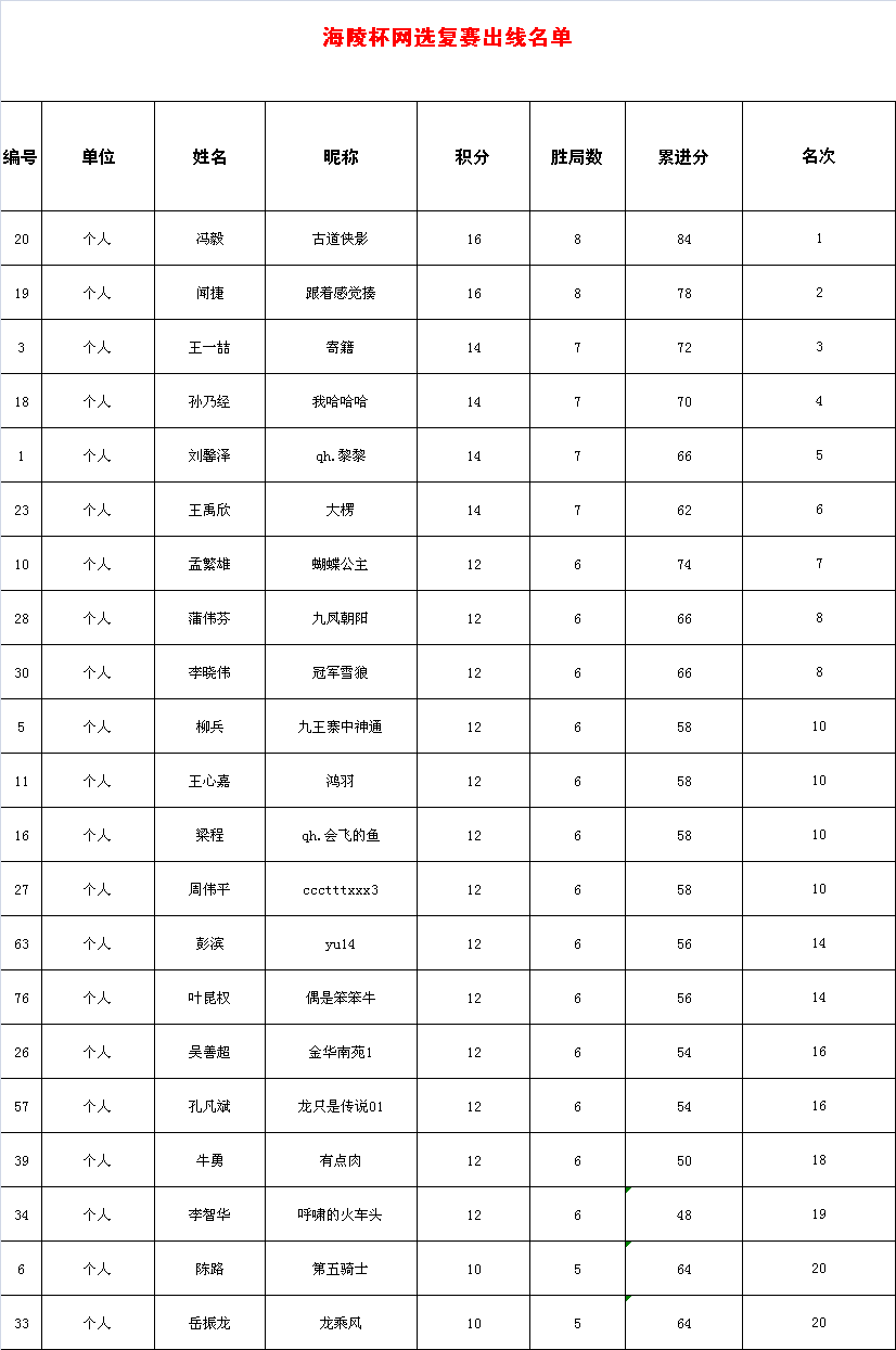 经过近一个月的紧张比赛,在10月21日"海陵岛杯"网络复赛最后一轮落下帷幕,9轮比赛结束后根据积分选出了排名前21的选手晋级最后的本赛,出线名单请见下表。这21位选手将参加2015年12月份4日在海陵岛皇冠大酒店举办的"海陵岛杯"中国业余围棋32强赛。报到时间为12月4日,请晋级选手保持联系方式畅通。